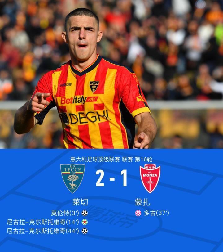 莱切2-1蒙扎,莫伦特闪击,多古乌龙,克尔斯托维奇破门+失点