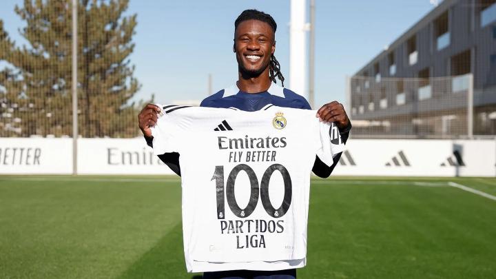 西甲第17轮,皇马在客场3-3战平巴列卡诺,卡马文加在本场比赛中替补登场,迎来了自己西甲生涯的100场里程碑。赛后,他领取了西甲100场纪念球衣。