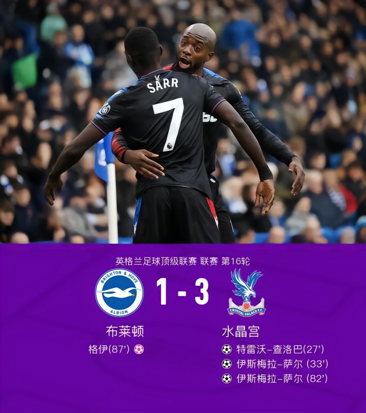 布莱顿主场1-3不敌水晶宫,萨尔2射1传,格伊自摆乌龙