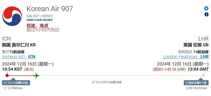 据悉,梁民革16日上午从仁川国际机场出发前往伦敦,据可查信息,梁民革乘坐的应为大韩航空907号班机,该机于韩国当地时间12月16日10点54分起飞,预计飞行时间为11小时10分,预计在伦敦当地时间12月16日下午13:04分抵达伦敦。