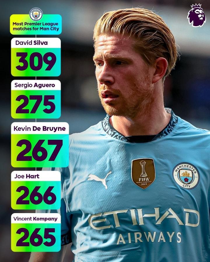 在周末曼市德比中,德布劳内完成曼城生涯英超第267次出场,这使得他超越乔-哈特,升至曼城队史英超出场榜第三。