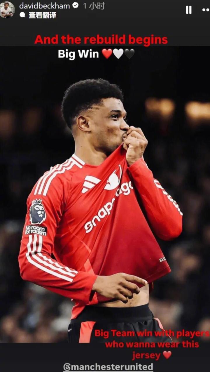 赛后,兴奋不已的曼联名宿贝克汉姆更新社媒,配文却耐人寻味:“重建开始了。巨大的胜利!