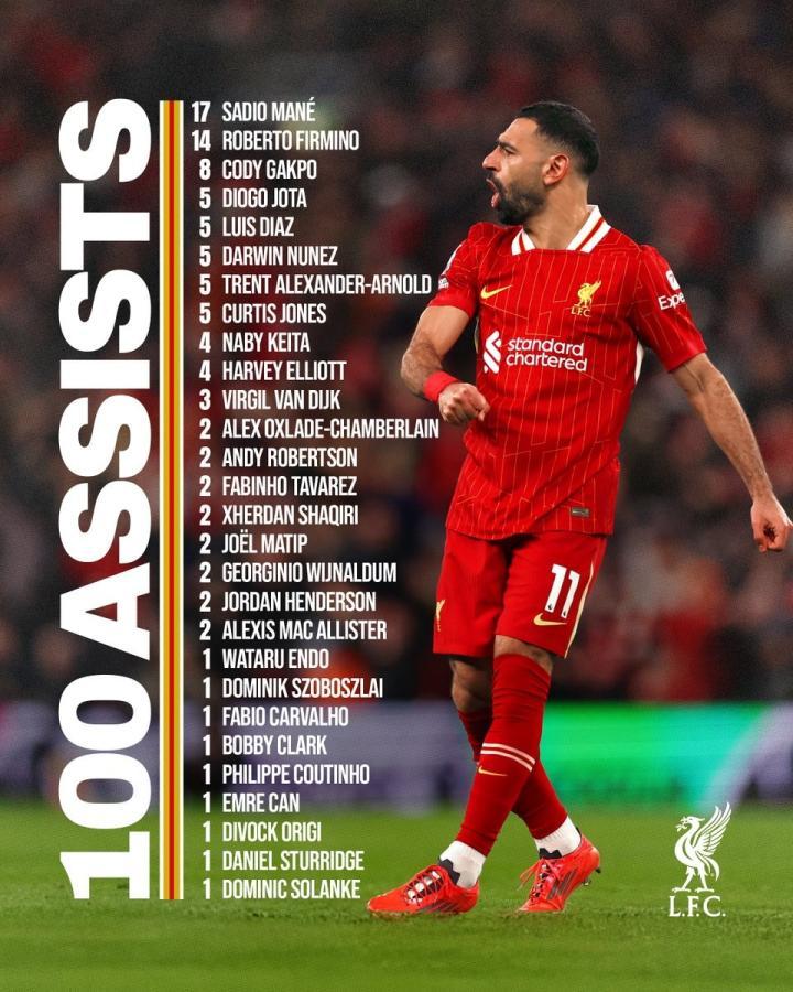 利物浦官方发布了萨拉赫的100次助攻分布,其中马内居首17次,菲尔米诺和加克波位列二三。