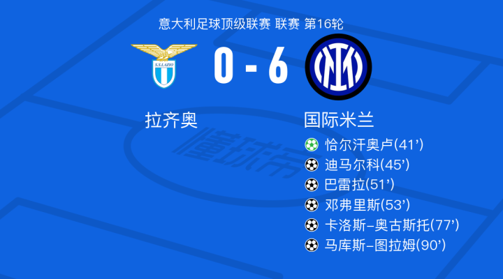 北京时间12月17日拉齐奥vs国际米兰,迪马尔科得到全场最高的8.4分,吉戈得到全场最低的5.1分