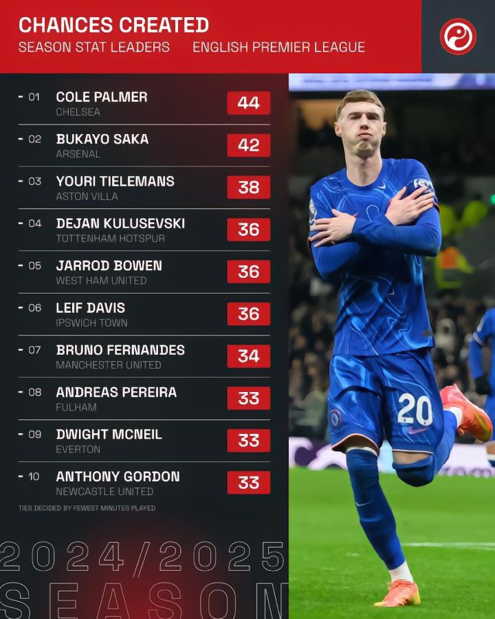 英超第16轮比赛已经结束,足球数据网站Squawka统计了本赛季球员在英超比赛中创造机会的次数,切尔西球星帕尔默44次居首,萨卡、B费在列。