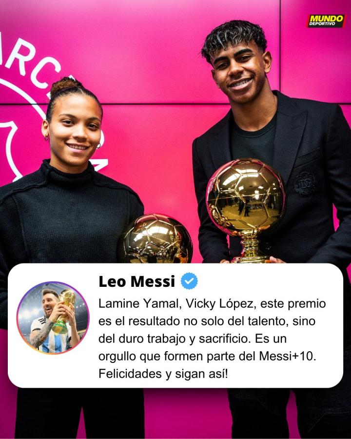 梅西为获得金童奖的亚马尔和女足金童奖的洛佩斯送上了祝贺,他表示:“金童奖这一奖项不仅仅是天赋的结晶,也是辛勤工作的回报。祝贺你们,继续努力!”
