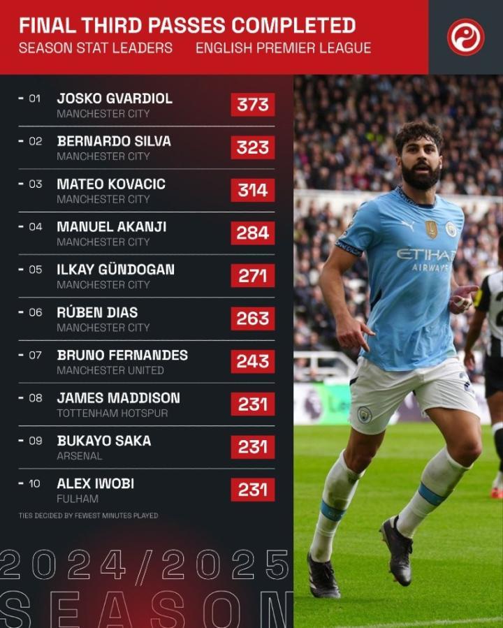 据统计,曼城后卫格瓦迪奥尔是本赛季英超联赛截至目前传球进入进攻三区次数最多的球员。