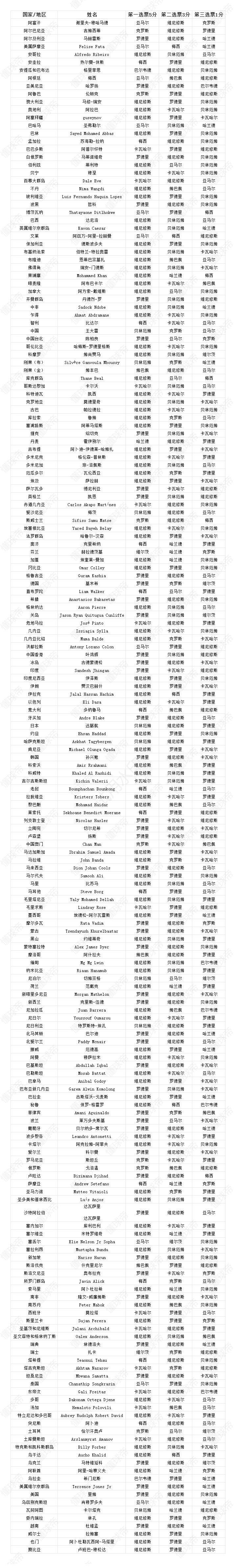 下图为代表队队长投票的完整结果: