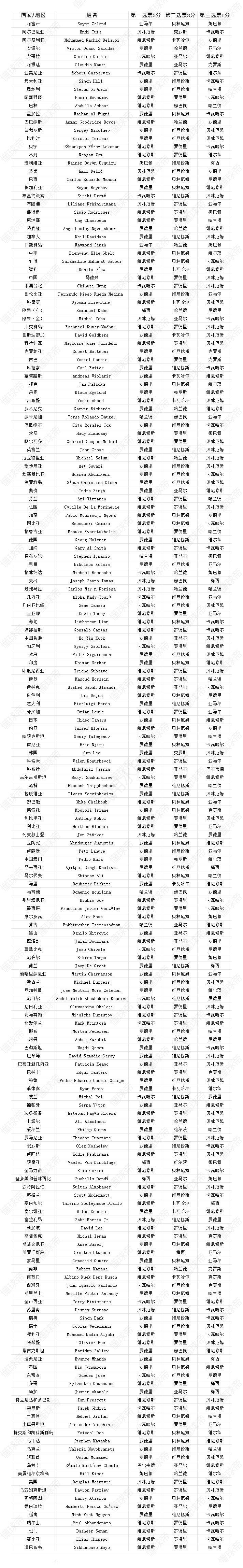 本届FIFA年度最佳共有187位各国的媒体代表参与评选,其三个顺位的票选结果如下: