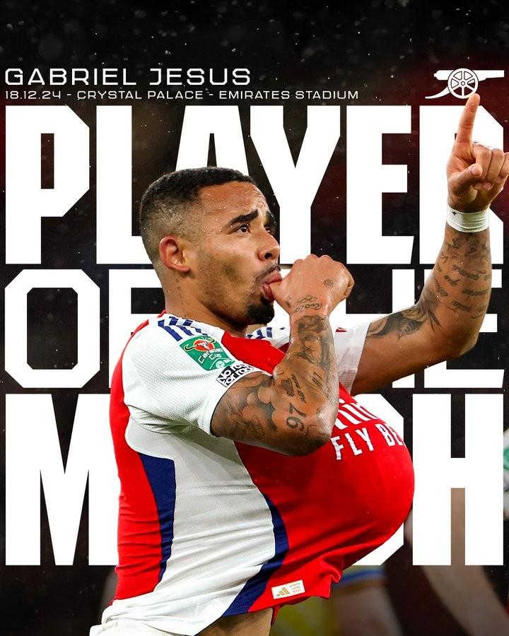 在对阵水晶宫的比赛中,热苏斯完成了帽子戏法,帮助球队取胜,赛后,他被阿森纳官方评为本场比赛队内最佳球员。