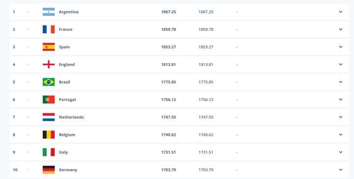 12月19日,FIFA官方公布了2024年终排名,其中前十位排名没有变化,阿根廷依旧第一,法国第二,西班牙第三,英格兰第四,巴西第五。