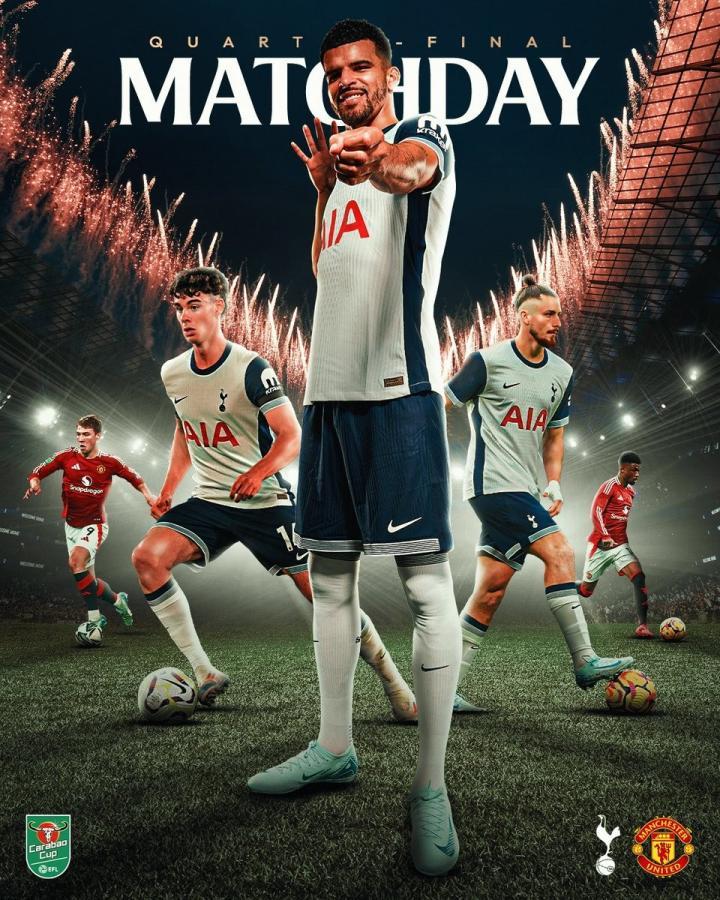 热刺将与曼联争夺本赛季英联杯最后一个半决赛席位,阿森纳、纽卡和利物浦已经提前晋级四强。