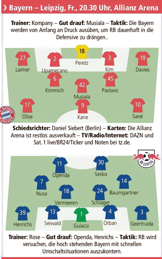 北京时间周六凌晨03:30,拜仁将迎来德甲第15轮主场对阵莱比锡的比赛,赛前,《慕尼黑日报》预测了双方的首发阵容。