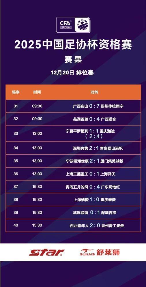 12月20日,足协杯资格赛排位赛全部战罢,历经三轮小组赛和一轮排位赛共四个比赛日的激烈角逐;最终陕西西北青年人获得第一,泉州青工获得第二。按照规则,排位赛前12将与中乙20支球队进行匹配(足协杯第一轮)。