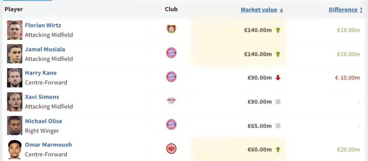 目前,穆西亚拉、维尔茨身价上涨1000万欧,现身价均为1.4亿欧元,为德甲最贵身价。凯恩身价下跌1000万欧,现身价为9000万欧元。