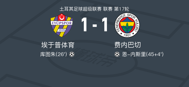 费内巴切客场1-1埃于普体育,科斯蒂奇助攻恩-内斯里破门