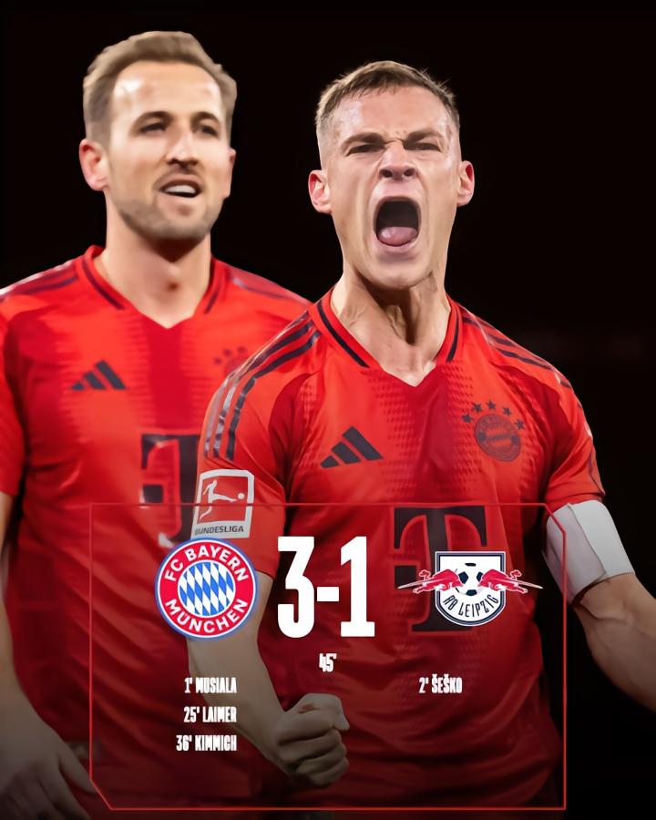在德甲第15轮的一场焦点战中,拜仁慕尼黑在半场过后主场3-1领先于RB莱比锡,穆西亚拉开场1分钟破门,谢什科第2分钟扳平比分,此后莱默尔和基米希又分别为拜仁取得进球。