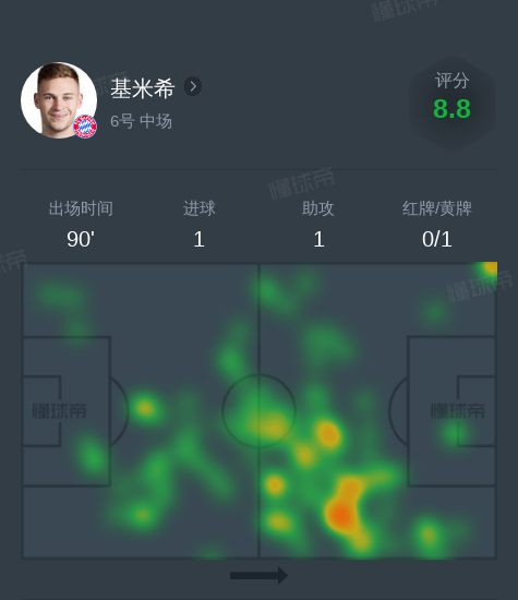 北京时间12月21日拜仁慕尼黑vsRB莱比锡,基米希贡献1球,1助攻,2次关键传球,2次射门。
