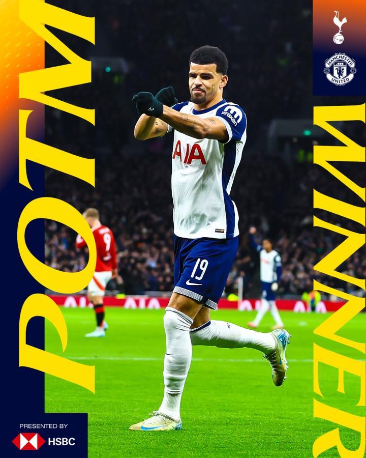 热刺官方消息,对阵曼联梅开二度的索兰克当选队内最佳球员。