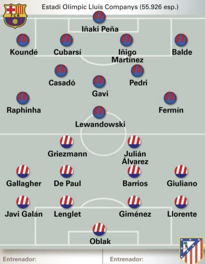 西甲本轮将迎来榜首大战,巴塞罗那主场对阵马德里竞技,《世界体育报》预测了两队的首发阵容。