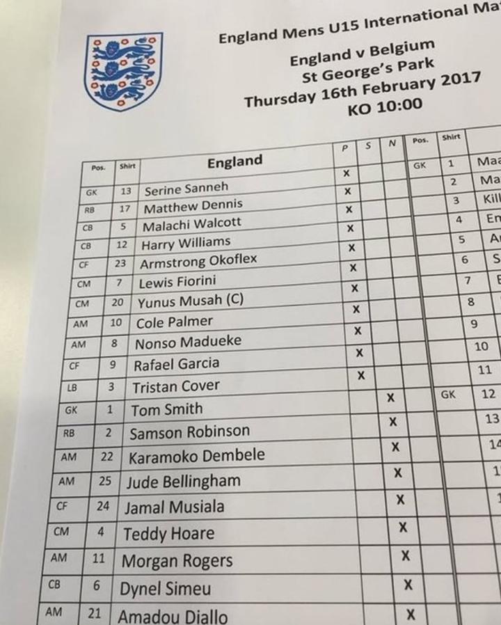 博主“TheeJerseyPlug”晒出了一张英格兰U15代表队2017年2月的比赛名单,名单中包括了贝林厄姆、穆西亚拉以及科尔-帕尔默这些当红的年轻球星。