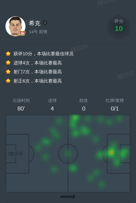 北京时间12月22日勒沃库森vs弗赖堡,希克贡献4球,1次关键传球,7次射门,1次成功过人。