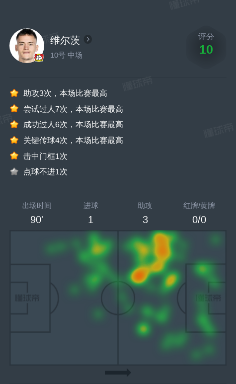 北京时间12月22日勒沃库森vs弗赖堡,维尔茨贡献1球,3助攻,4次关键传球,3次射门,6次成功过人。