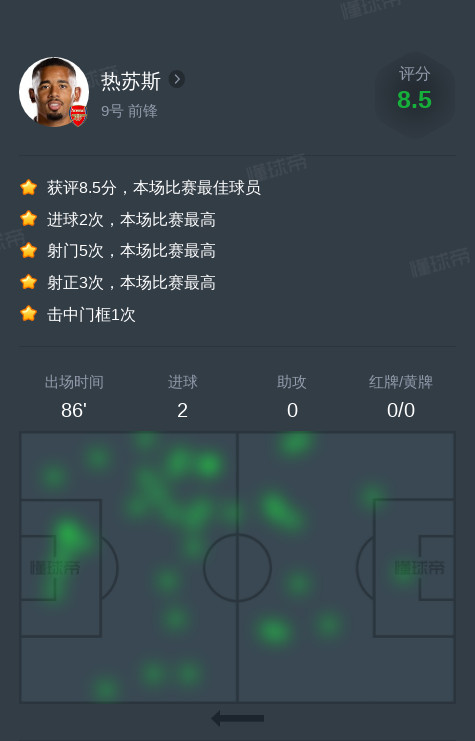 北京时间12月22日水晶宫vs阿森纳,热苏斯贡献2球,5次射门,1次成功过人。