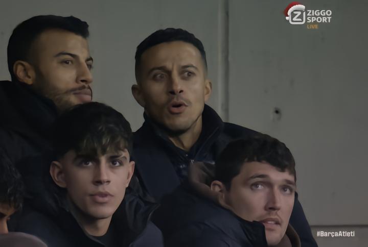 西甲第18轮,巴萨主场对阵马竞,转播镜头找到了坐在看台上的蒂亚戈和拉菲尼亚兄弟两人。