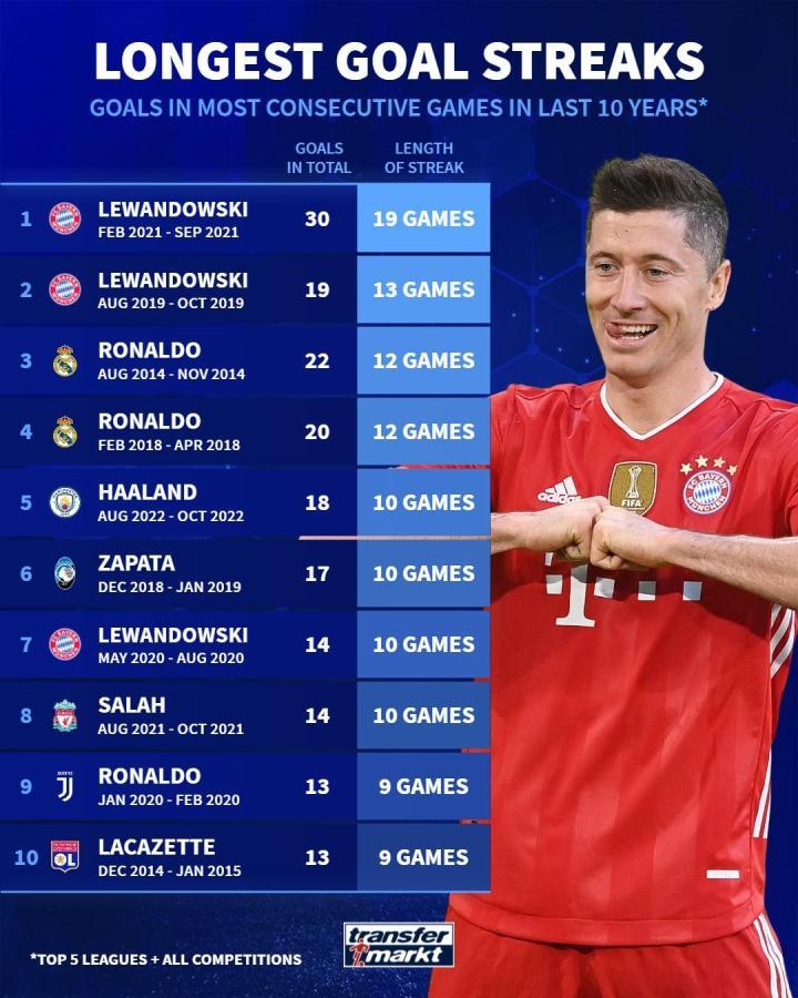 德国转会市场网站列出了近10年五大联赛球员连续进球场次排行,莱万占据前二,C罗位列第三、第四。