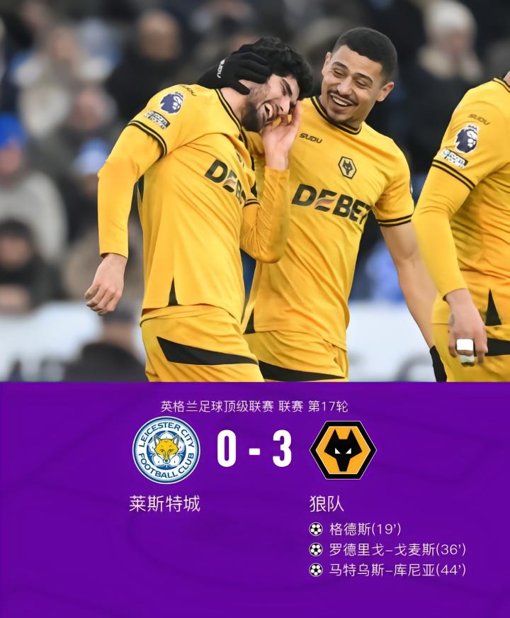 狼队3-0完胜莱斯特城,格德斯传射,库尼亚、戈麦斯建功