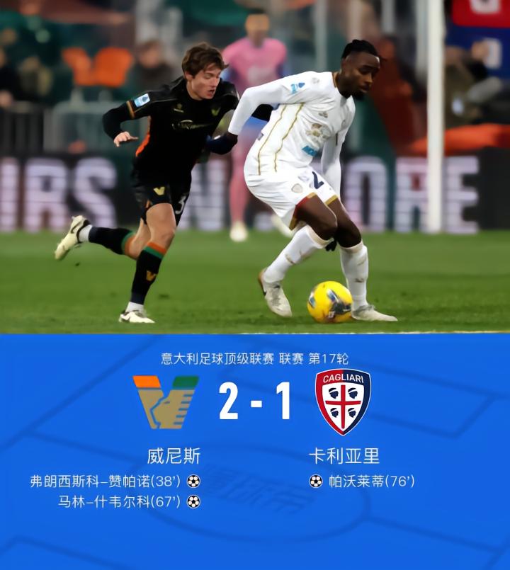 威尼斯2-1卡利亚里,赞帕诺、什韦尔科建功,帕沃莱蒂破门