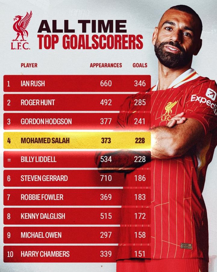 至此,萨拉赫利物浦生涯373次出场已打入228球,这使得他追平比利-利德尔,升至利物浦队史射手榜第四位,仅次于伊恩-拉什(346球)、罗杰-亨特(285球)和戈登-霍奇森(241球)。