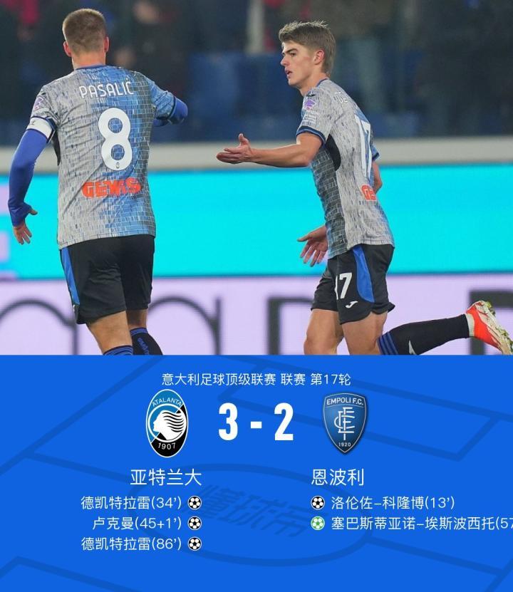 亚特兰大3-2恩波利斩获联赛11连胜,CDK双响,卢克曼破门