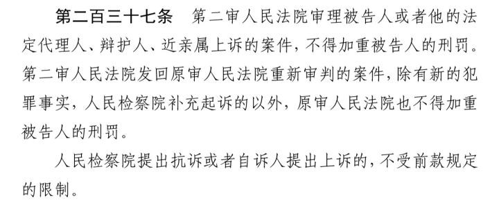 根据《刑事诉讼法》第二百三十七条,第二审人民法院审理被告人或者他的法定代理人、辩护人、近亲属上诉的案件,不得加重被告人的刑罚。第二审人民法院发回原审人民法院重新审判的案件,除有新的犯罪事实,人民检察院补充起诉的以外,原审人民法院也不得加重被告人的刑罚。人民检察院提出抗诉或者自诉人提出上诉的,不受前款规定的限制。