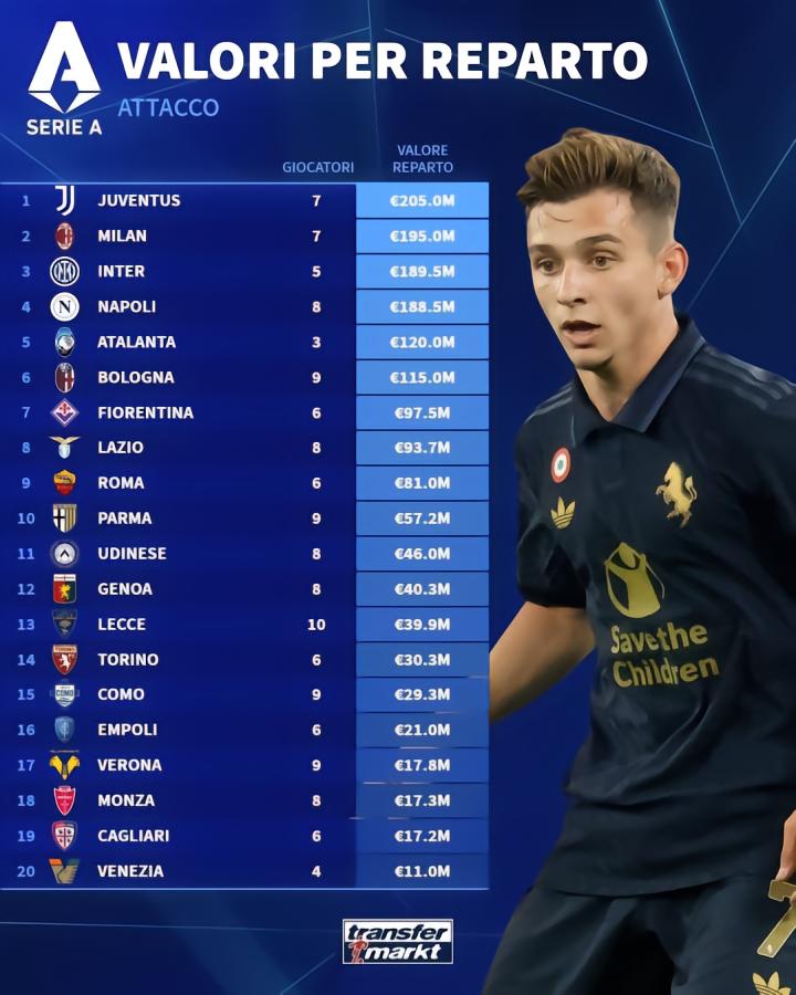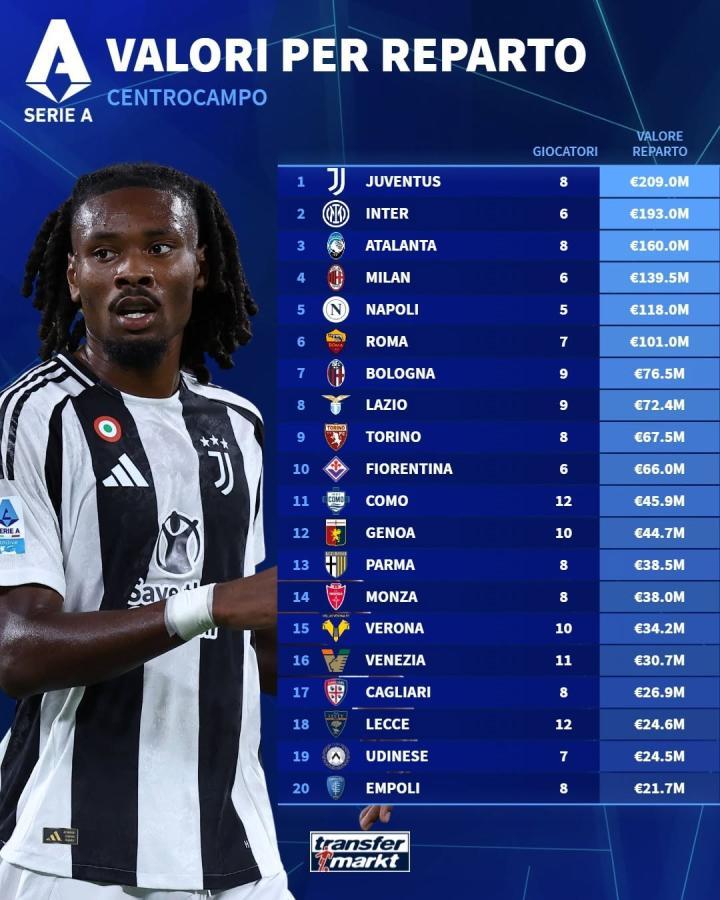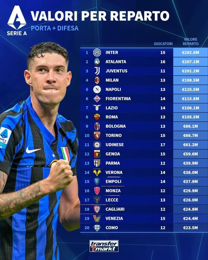 在更新了意甲球员的身价之后,德转还统计了意甲各支球队防线、中场以及锋线的身价排行,国际米兰防线身价第一,而中场和锋线尤文图斯均排名第一。