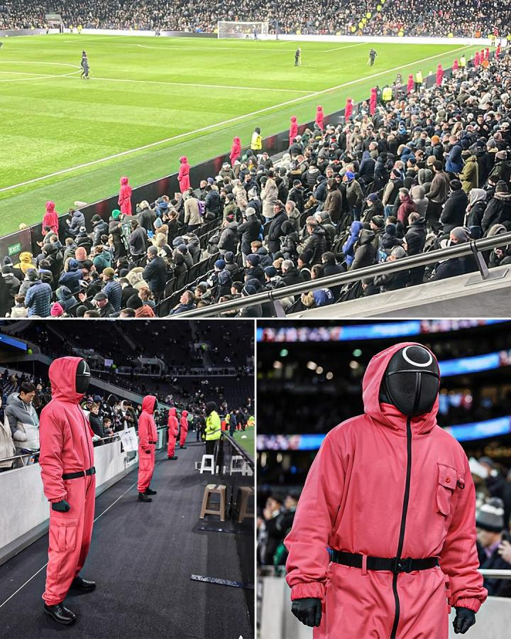 12月23日凌晨的英超第17轮热刺坐镇主场对阵利物浦的比赛中场休息时,即将播出第二季的韩国网剧《鱿鱼游戏》中的蒙面人出现在了热刺主场的看台上。