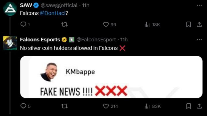 不久前,在上海Major上表现出色的ewjerkz被SAW下放至替补席。在neL发布爆料后,Falcons社媒官方也进行了更新,他们用C罗的动图做出回应,并与SAW的官方社媒进行互动,疑似证实了这一消息。