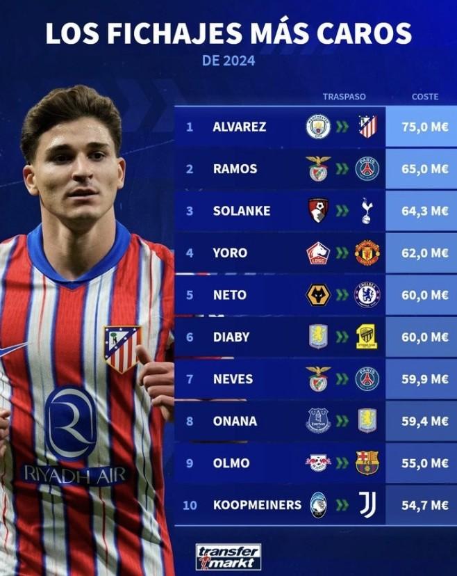 今天,德国转会市场盘点了2024年世界足坛最贵转会排名。其中,阿尔瓦雷斯以7500万欧元从曼城转会马竞排名第一。