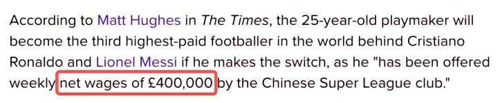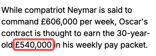 在2019年12月份,奥斯卡与上海海港续约五年,新合同的周薪为54万英镑的周薪,折合成年薪为2808万英镑。
