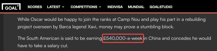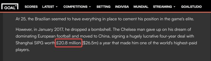 需要提前说明的是,本次计算并未考虑广告代言费等场外收入,仅计算奥斯卡球员合同中的收入。另外不管是俱乐部官方还是球员个人均没有透露过年薪的具体金额,本次计算只考虑媒体报道披露的年薪金额,可能与实际收入有差别。