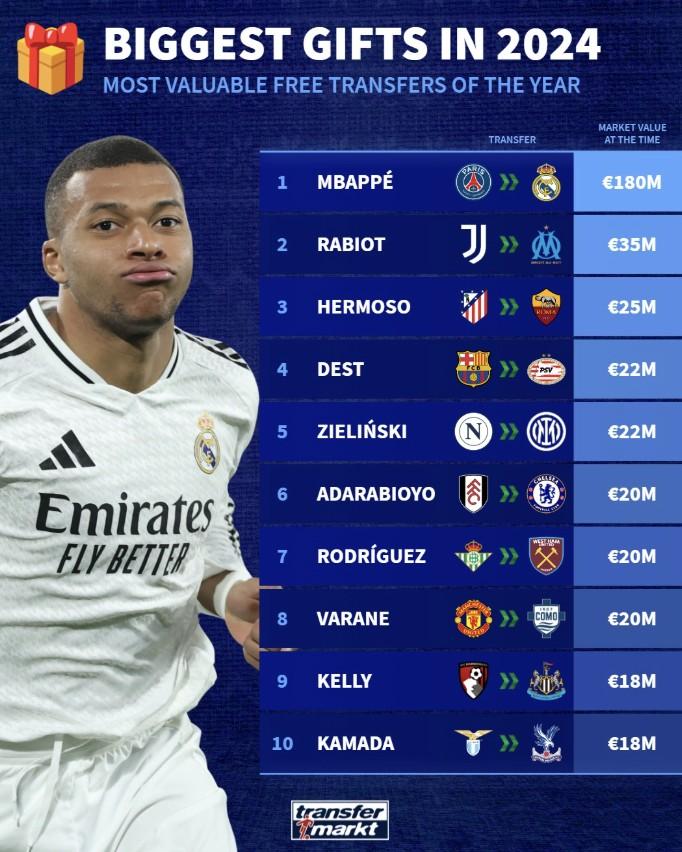 今天,德国转会市场列出了在2024年进行自由转会的球员身价榜单。