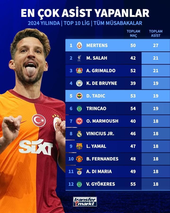 1. 梅尔滕斯(加拉塔萨雷)50场27次助攻