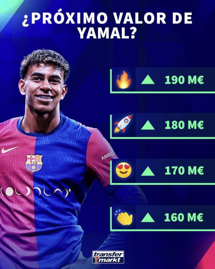 本周五,德国转会市场将更新西甲球员的身价。今日德国转会市场发布了预热,亚马尔的身价将继续上涨,更新后的身价可能会是1.6亿欧元、1.7亿欧元、1.8亿欧元或者1.9亿欧元。