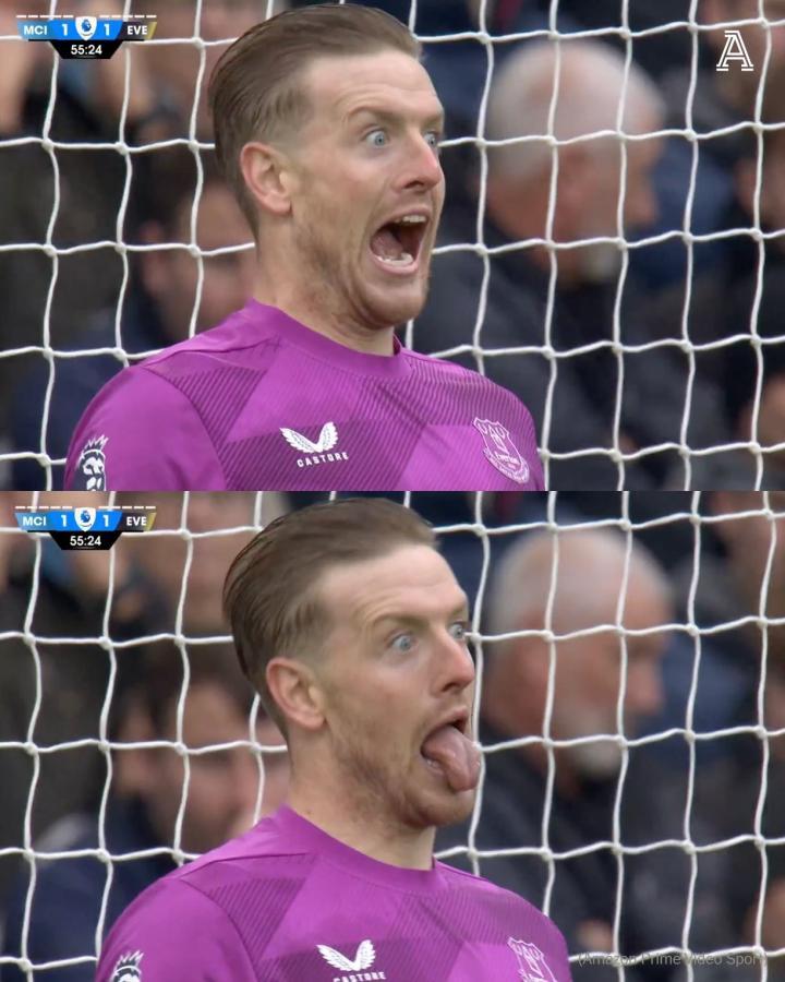 在哈兰德主罚点球前,皮克福德做出了鬼脸动作干扰哈兰德,结果他真的扑出了挪威前锋的点球。在扑出哈兰德的点球后,皮克福德还调皮地眨了眨眼。