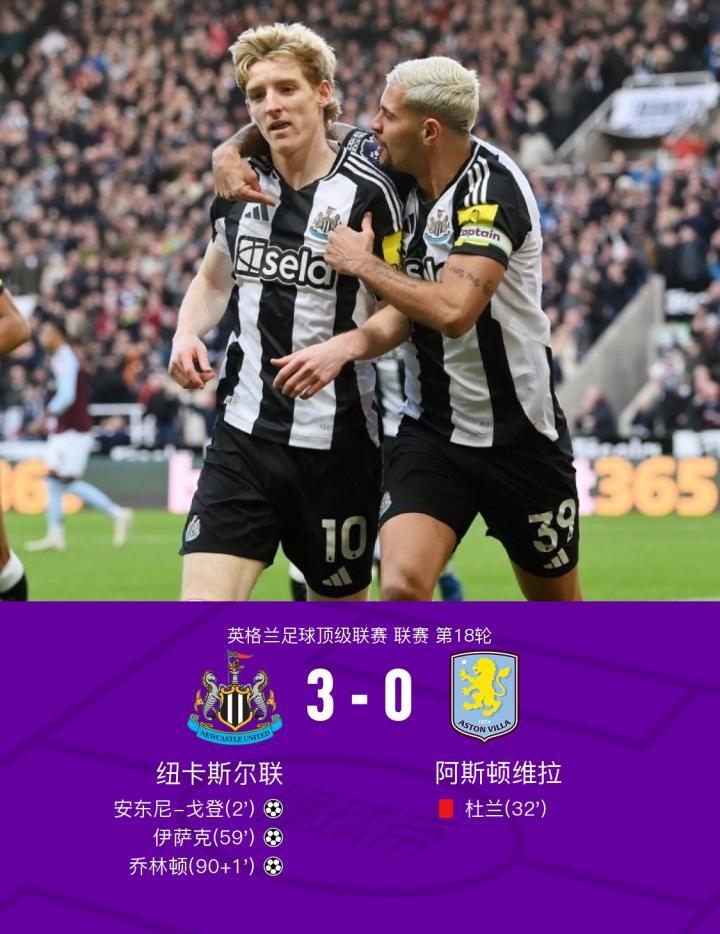 纽卡3-0十人维拉,戈登、伊萨克、乔林顿破门,杜兰踩踏染红