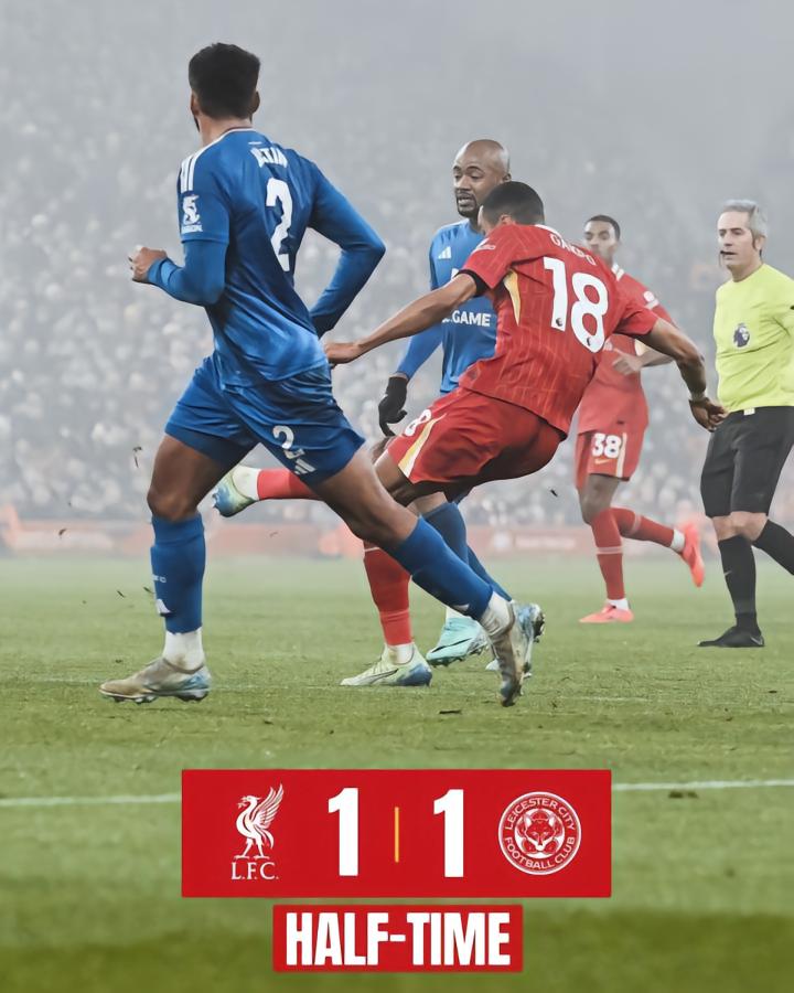 在英超第18轮的比赛中,领头羊利物浦在主场上半时过后1-1与莱斯特城战平,乔丹-阿尤开场仅仅6分钟就为狐狸军团率先破门,加克波上半场补时第1分钟为红军将比分追平。