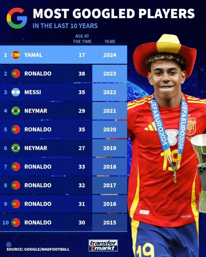德转列出了近10年每一年在搜索引擎上被搜索次数最多的球员,C罗6次上榜排名第一,内马尔2次上榜,梅西仅1次,西班牙和巴塞罗那的17岁新星亚马尔则在2024年排名第一。