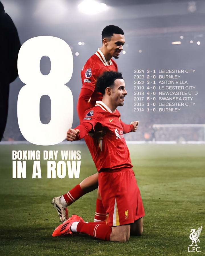 英超第18轮,利物浦主场3-1逆转击败莱斯特城,取得节礼日比赛8连胜。