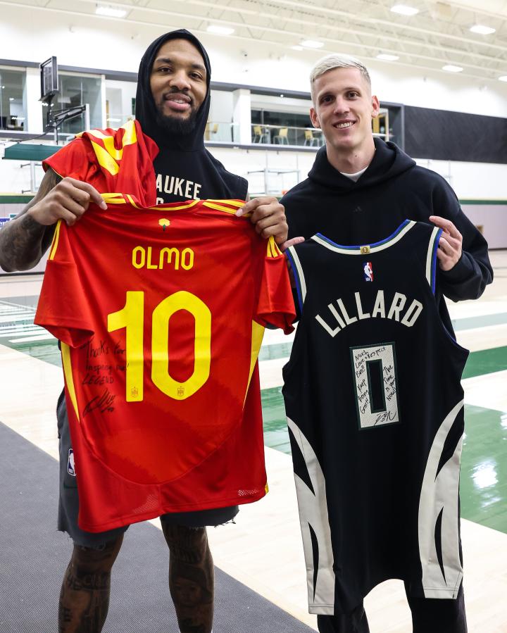 奥尔莫和利拉德互换了球衣,还赠送了他一双印有两人庆祝动作的定制球鞋。奥尔莫表示,他已经关注利拉德很长时间了。